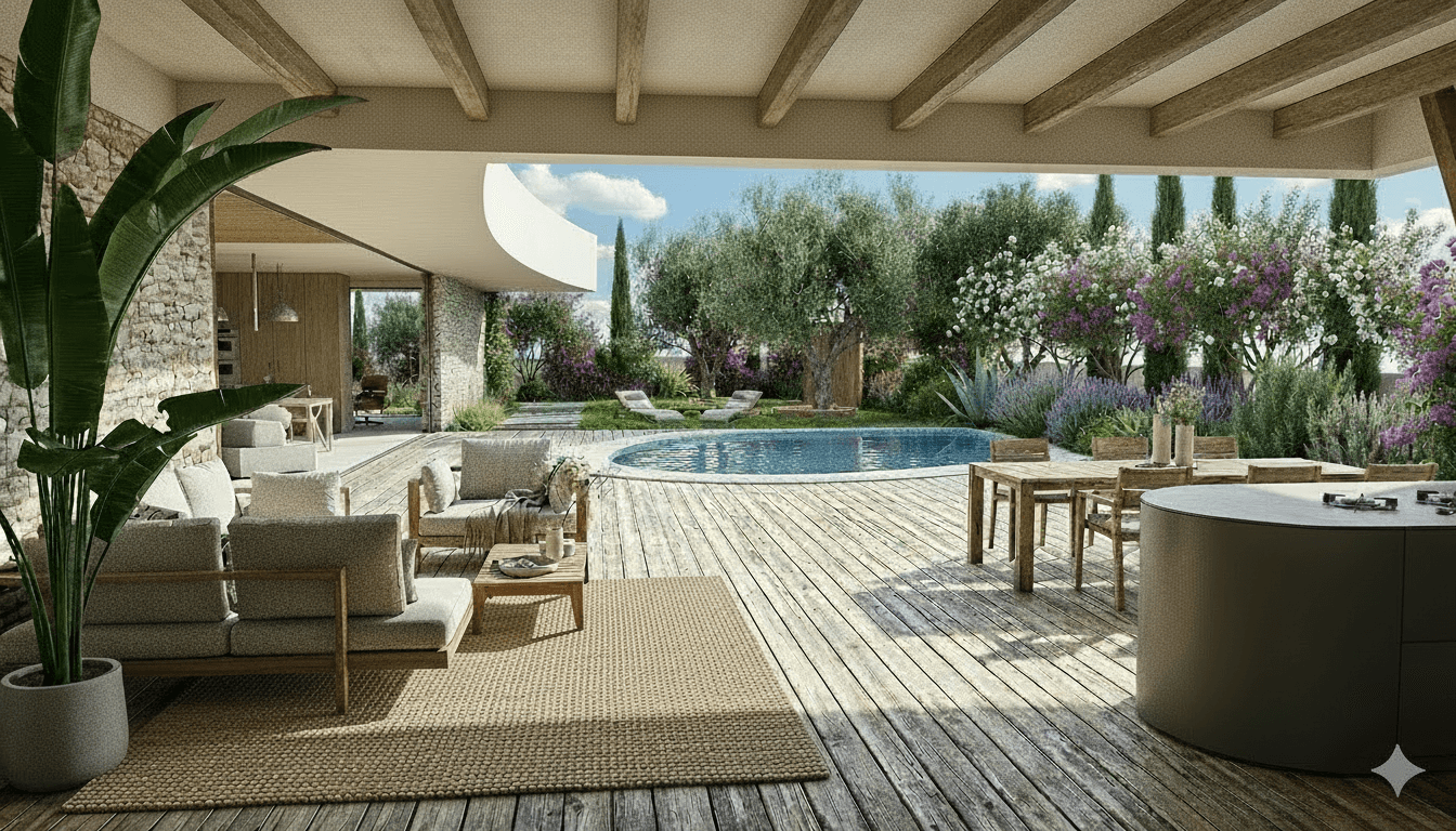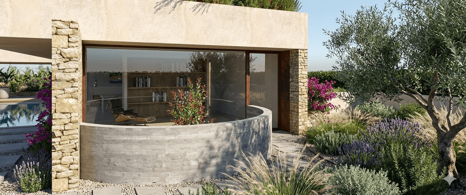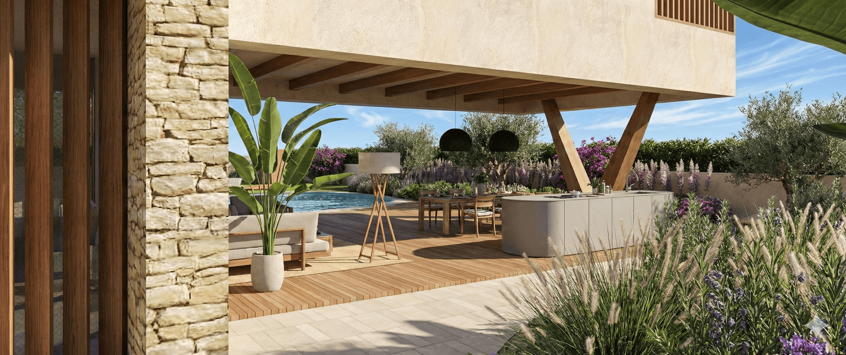 Los materiales empleados son morteros, maderas y detalles en acero corten.